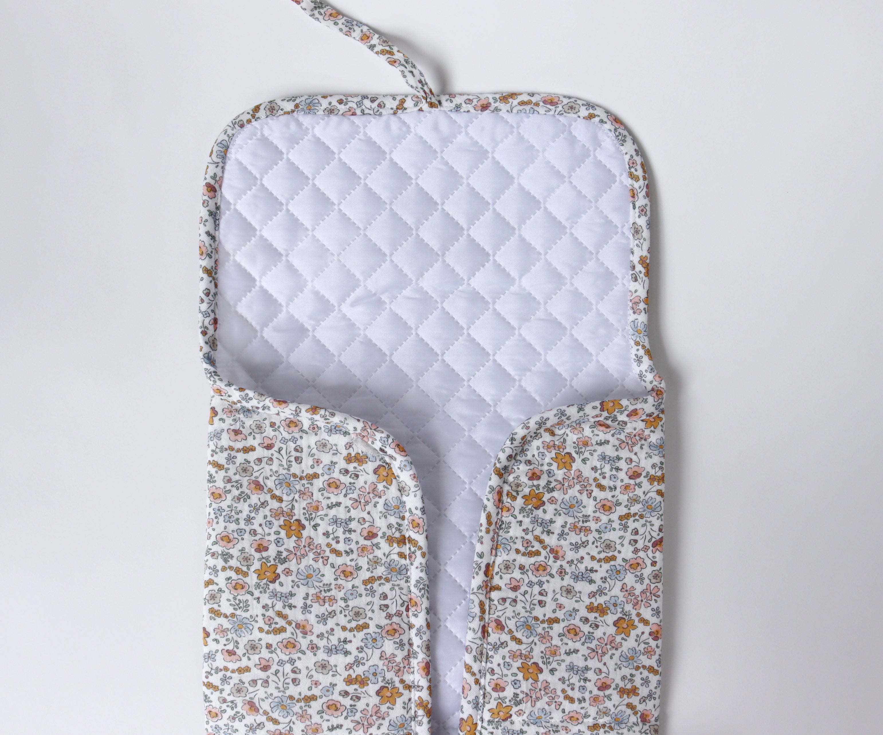 Cambiador de paseo Sasha en algodón 100% con interior impermeable. Diseño de florecitas. Cómodo y fácil de plegar.