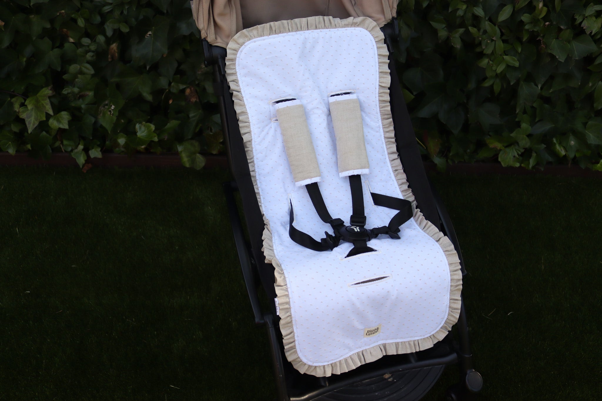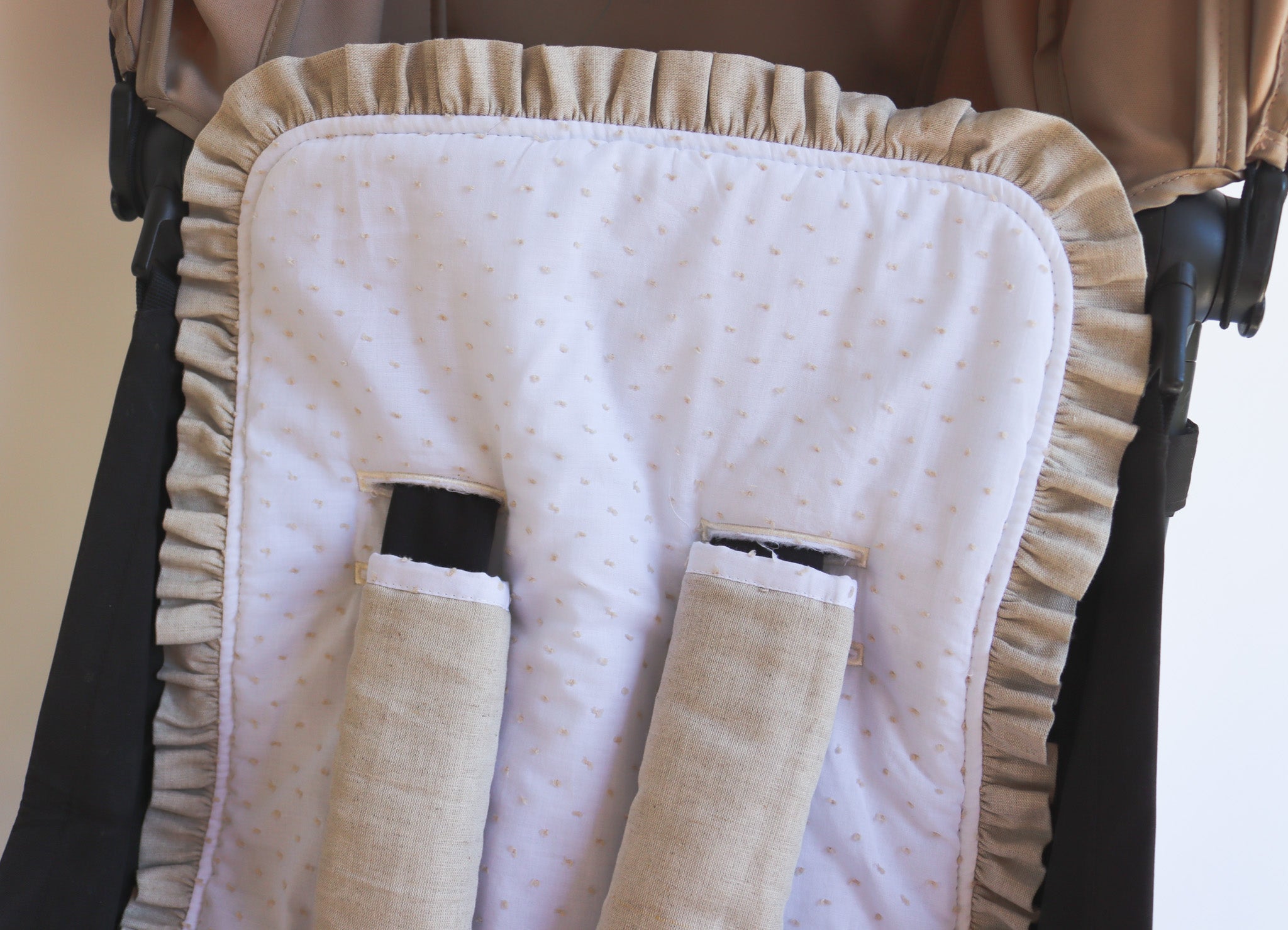 Colchoneta universal para silla ligera de la colección ANDY, perfecta para mantener a tu bebé cómodo en paseos largos. Diseño elegante en tejido plumeti blanco con puntitos beige y volante lino beige 100% algodón.