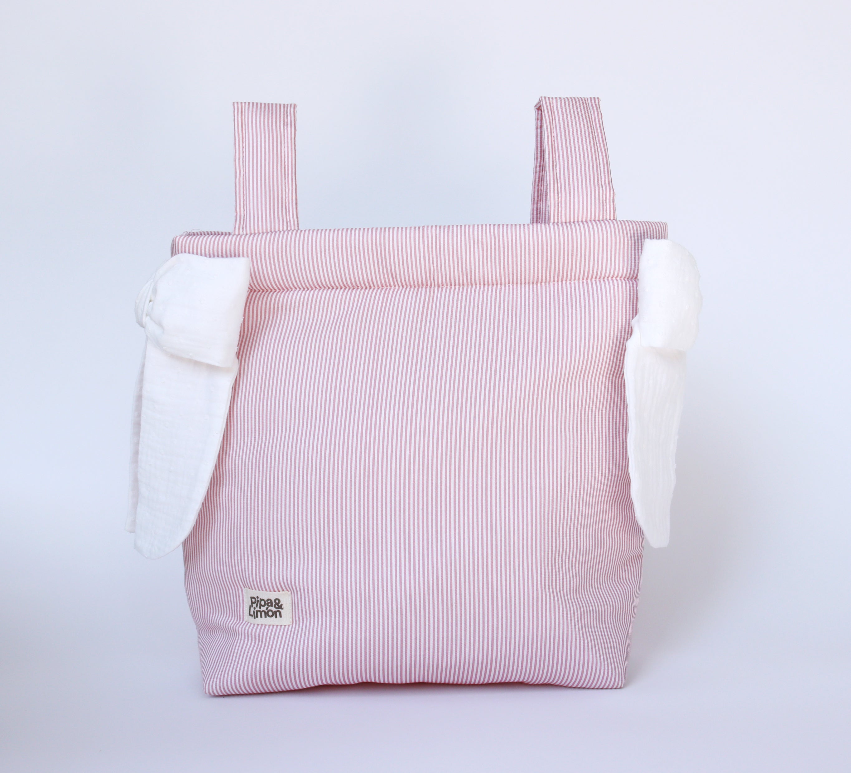 Bolsa panera de la colección Pink stripes. Diseño pink stripes con lazos bambula plumeti blanco.