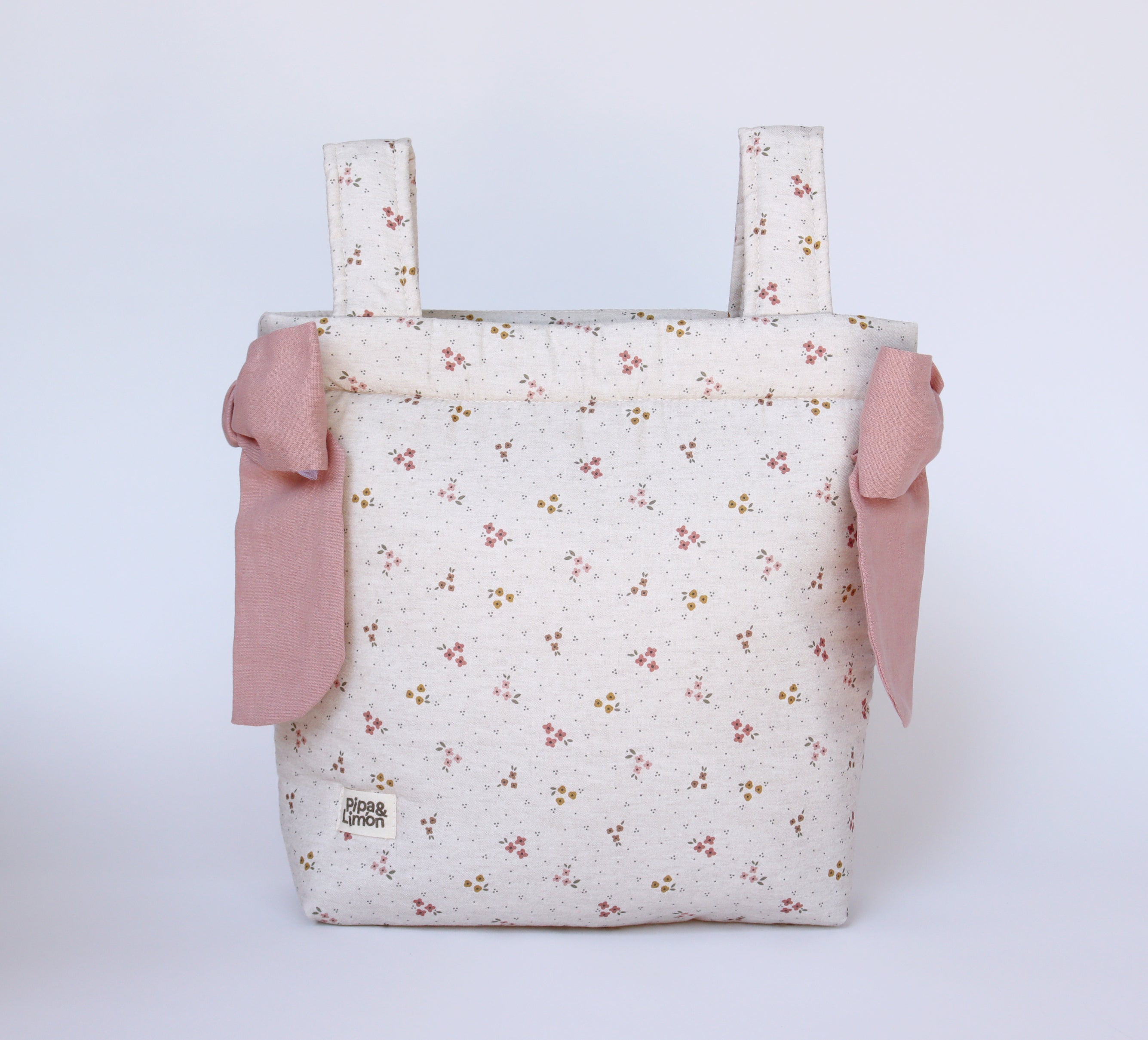 Bolsa panera de la colección Daniela. Diseño flores con lazos lino rosa nude.